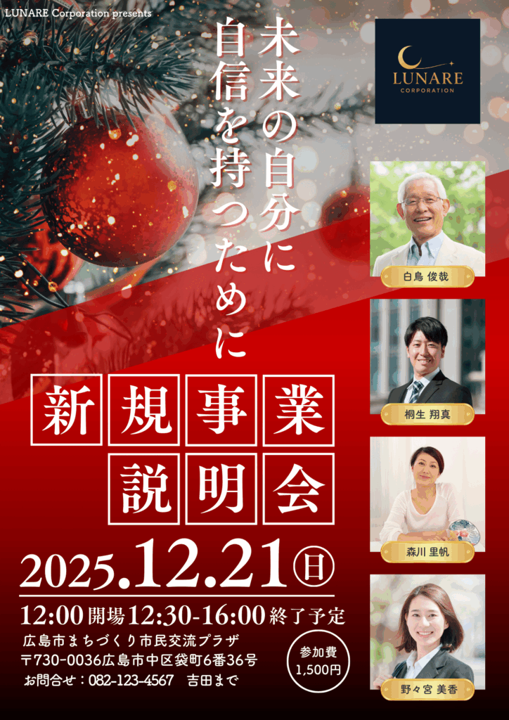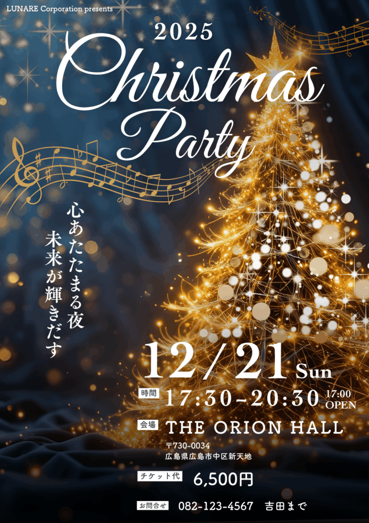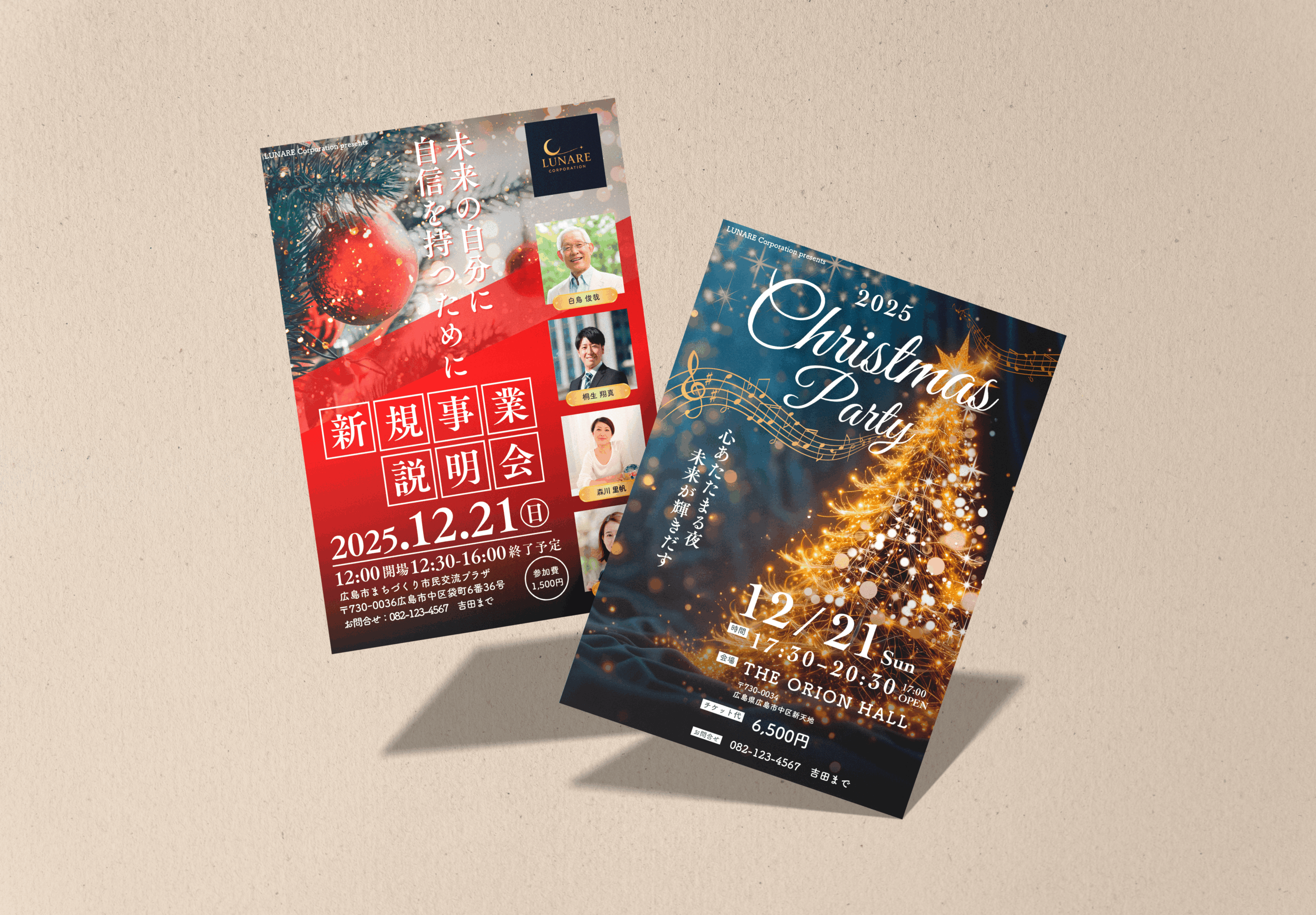 年末に開催された企業セミナーとパーティイベントのチラシをデザインしました。ポートフォリオ掲載にあたり、実際の顔写真・お名前・会場名などの情報はすべて架空のものに差し替えています。