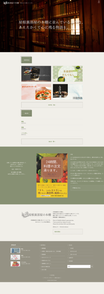 また、筆者が自費出版した書籍も、サイトを訪れた方々に注目されるように、トップに書籍の画像を掲載して試し読みもできるようにしました。不定期に更新されるブログ記事は小説よりも目立たないように心がけています。