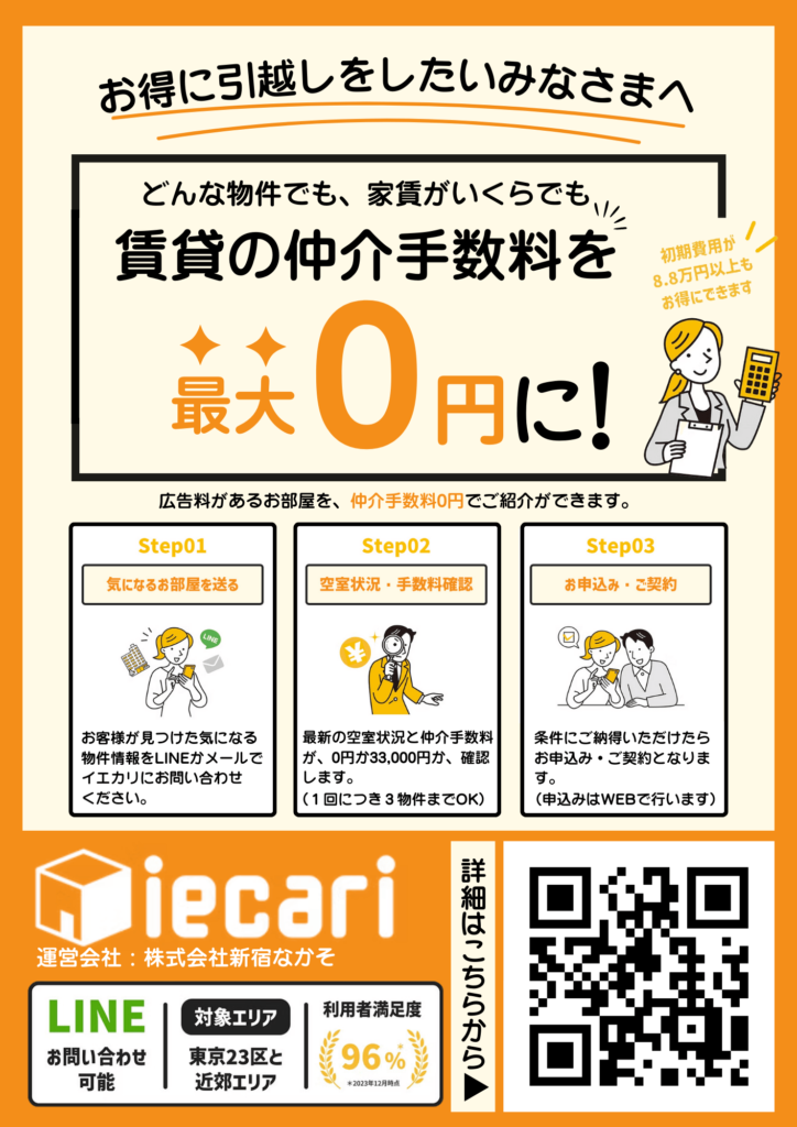賃貸仲介手数料が最大0円になる「iecari」様のフライヤー制作です。コストメリットを強調しつつ、ユーザーがスムーズに問い合わせできるよう、視認性と分かりやすさを重視したデザインを提案いたしました。