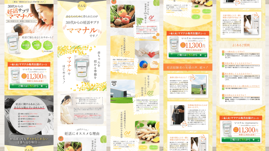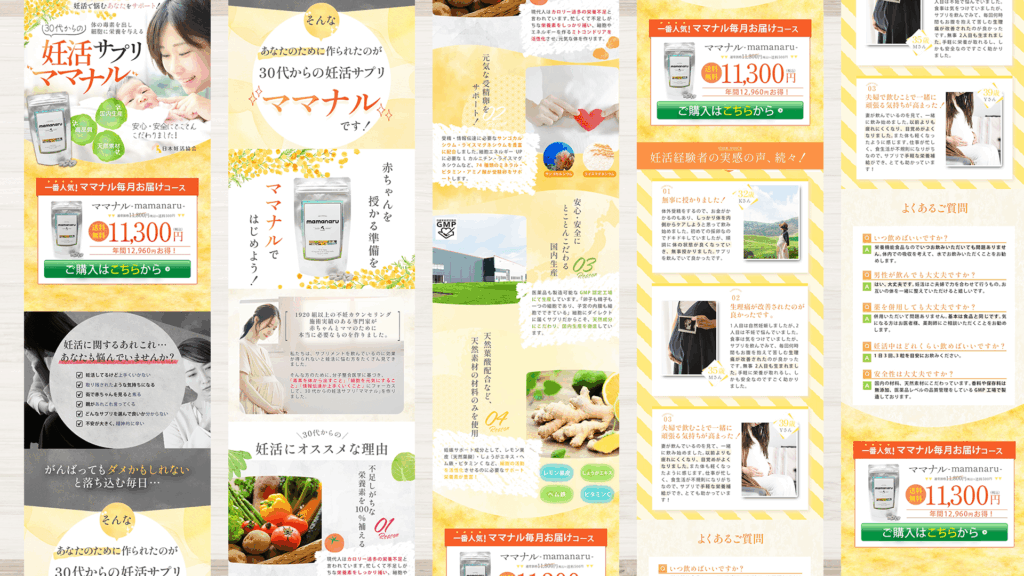 日本デザインスクールの課題で、妊活サプリのホームページを制作しました。妊活に何度も失敗している30歳代〜40歳代の女性を対象に、優しく親しみやすい雰囲気を目指して制作しています。